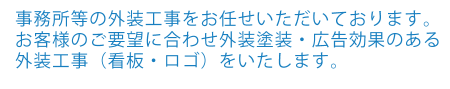 事務所・店舗の外装・内装工事、防水工事、塗床工事をお任せいただいております。 お客様のご要望に合わせ(外装塗装・)←削除してください広告効果のある外装工事(看板・ロゴ等)をいたします。業務に影響しないよう、入念にお打ち合わせをし、工期や作業時間もご相談いただけます。もちろんご予算のご相談もお伺いの上、ご希望をご希望以上に仕上げますので、どのような工事をお考えか、まずはご相談ください。