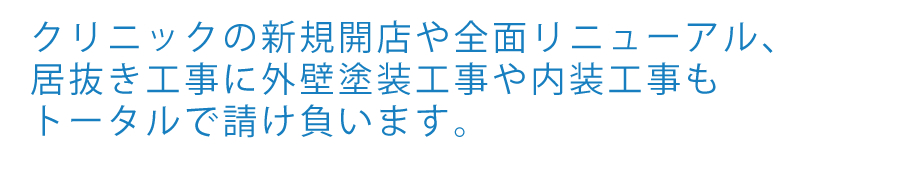 クリニックの新規開店や全面リニューアル、居抜き工事に外壁塗装工事や内装工事もトータルで請け負います。東海三県でも多くのクリニック改修工事をさせていただきました。この経験を活かし、病院・接骨院・歯科等を経営されている院長へ、地元の利を活かした親しみのある改修工事をさせていただきます。ご予算やご要望にご満足いただけるご提案をさせていただきます。