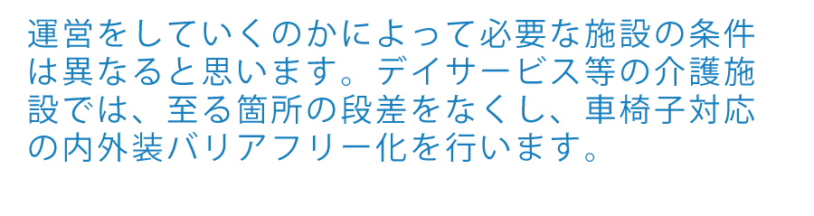 運営をしていくのかによって必要な施設の条件は異なると思います。デイサービス等の介護施設では、至る箇所の段差をなくし、車椅子対応の内外装バリアフリー化を行います。外壁塗装では、清潔感のある快適に過ごせるような雰囲気に仕上げます。安全と安心を両立する福祉施設への改装工事をさせていただきます。新規設立にも対応しておりますので、小規模改装から大規模新装工事まで、お気軽にお問い合わせください。