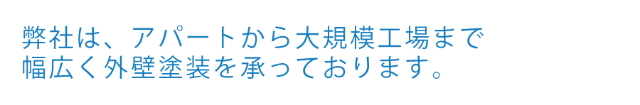 事務所・店舗の外装・内装工事、防水工事、塗床工事をお任せいただいております。 お客様のご要望に合わせ(外装塗装・)←削除してください広告効果のある外装工事(看板・ロゴ等)をいたします。業務に影響しないよう、入念にお打ち合わせをし、工期や作業時間もご相談いただけます。もちろんご予算のご相談もお伺いの上、ご希望をご希望以上に仕上げますので、どのような工事をお考えか、まずはご相談ください。